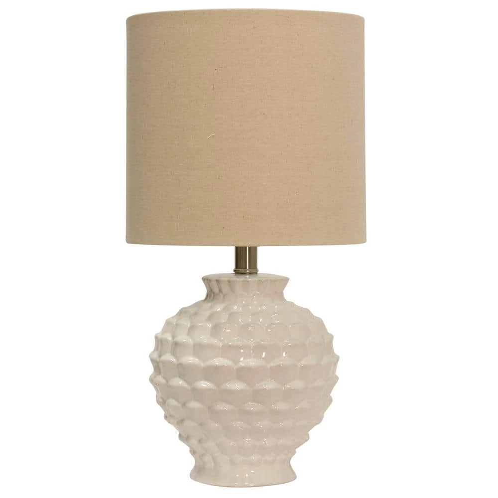 This ceramic table lamp is made with a classic profile and stark white finish with a dimpled motif. Its squat body and beige fabric hardback shade gives it a composed contemporary quality that is ideal for bringing out the personality of any home. It’s a smart addition to sofa tables, consoles, entryways, and so much more.