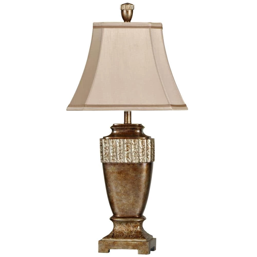 The Conway table lamp draws influence from antique favorites to create a contemporary lamp with unique elegance. Crafted from polyresin with a vintage gold finish urn body, this lamp has a square base and delicate silver leaf detailing to give it a genuine heirloom quality. It comes complete with a beige fabric shade that tapers outward for a throwback appeal.