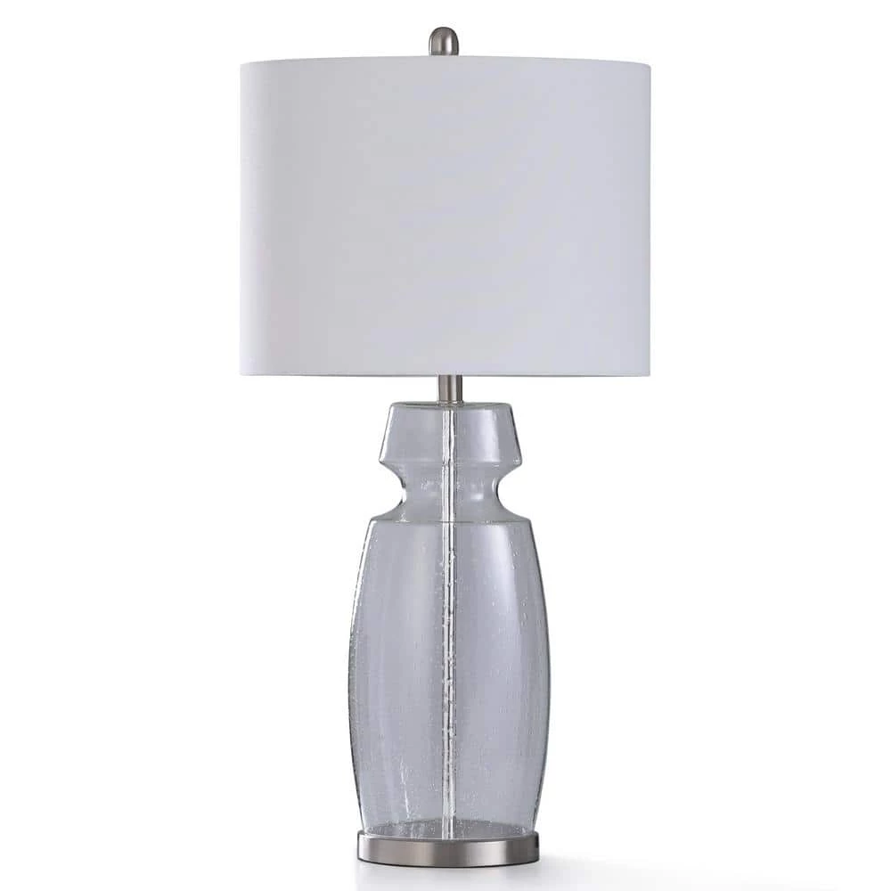 This Nevaeh table lamp features a clear seeded glass body supported by an artful brushed-steel base. The eye-catching curved structure makes it a soft, yet versatile design element that will seamlessly blend with your home’s current aesthetic. Complete with a pristine hardback shade, this lamp is the perfect addition to bedrooms, living rooms, hallways and foyers alike.