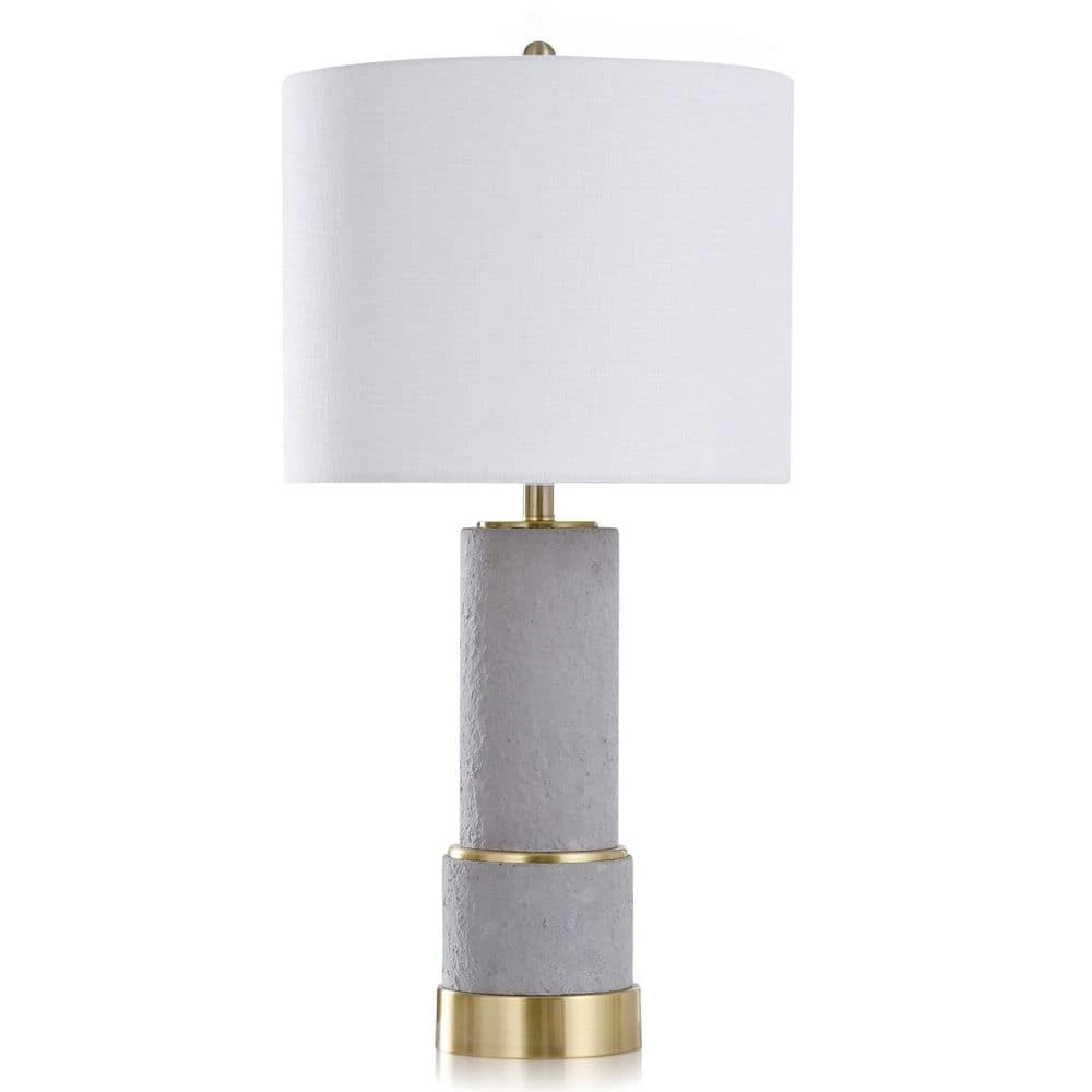 This StyleCraft Gold Metal & Concrete Table Lamp is the perfect blend of glamour and modern industrial design. Its base is a staggered column of concrete and gold-tone metal. The hardback linen shade complements the base with its drum shape and creates a broad wash of ambient light in a living room or office.