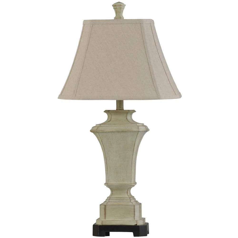 A cream-colored table lamp with three-way functionality, this fixture has a softback shade and a polyresin frame. The dark color of the base is a sharp contrast to the cream finish on the frame and the taupe shade. With its neutral colors, this cream table lamp is a versatile option for a bedroom, office, dining room, hallway, or living room.