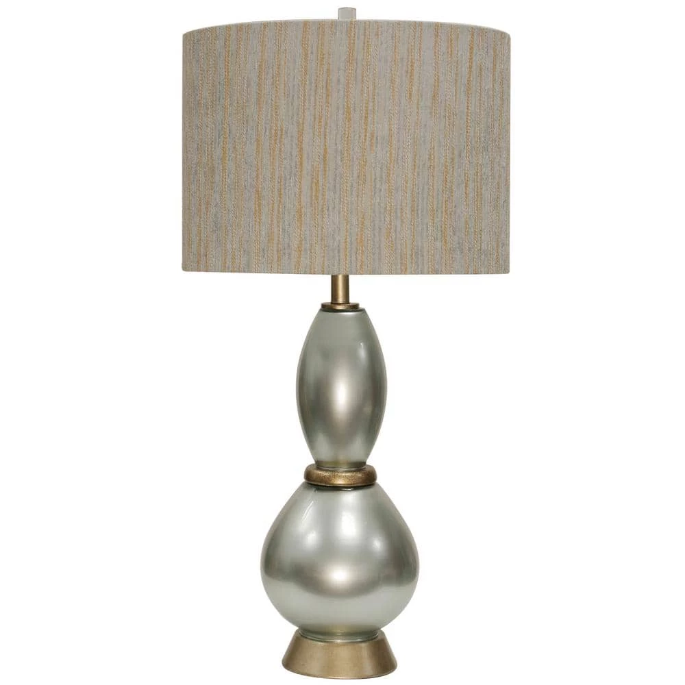 This glass and steel table lamp uses a handsome rounded frame to give any tabletop a new feel. Its combination of a rounded glass and steel ensemble with a classic hardback shade makes it a unique touch. This piece exemplifies superior product design and great styling at an unbeatable price.