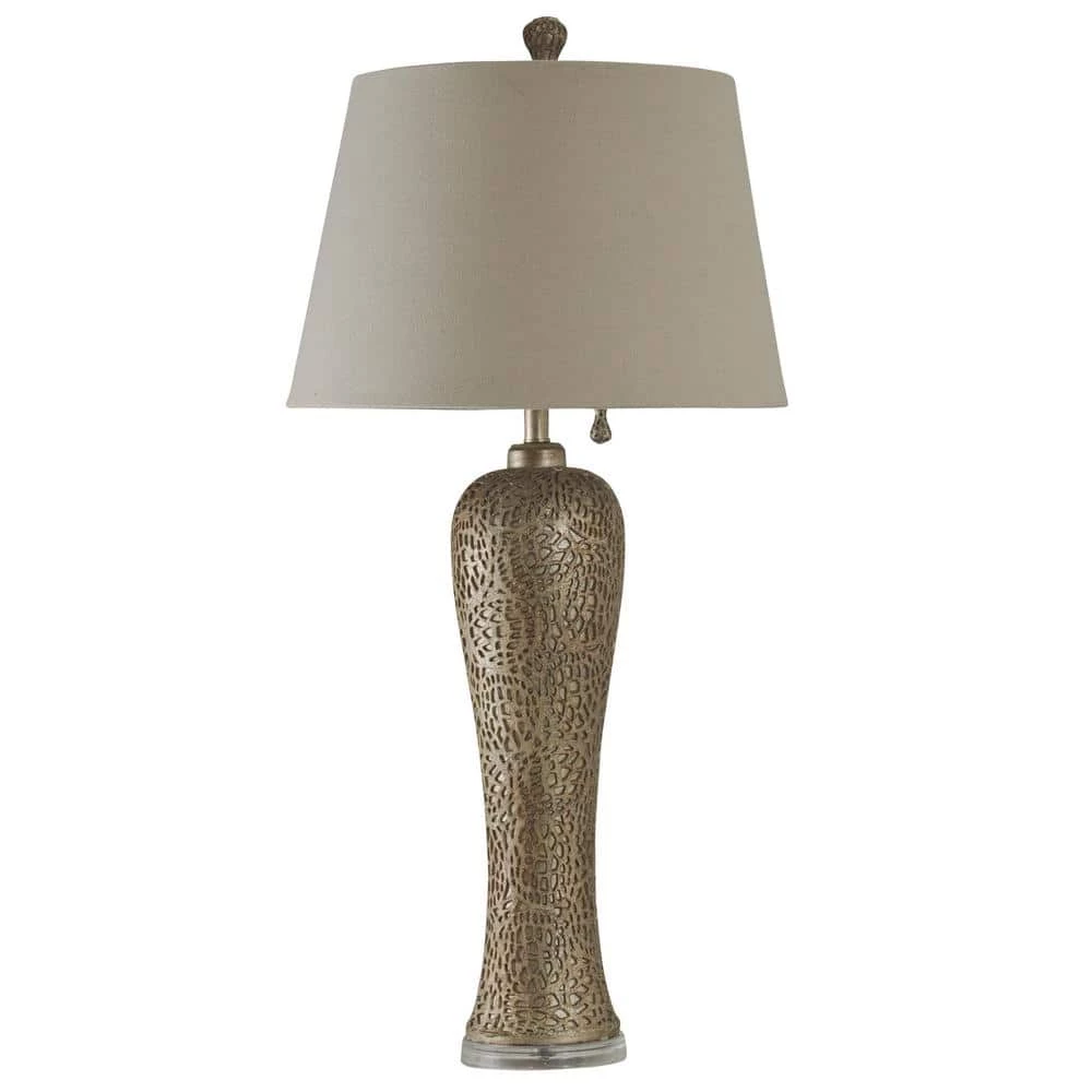 This table lamp from Jane Seymour is a stylish contemporary accent with delicate detailing that brings out the best in a room. Crafted with subtle cutaway patterning, its body is finished in a bellevue silver tone that comes to life when paired with a white hardback shade. It’s an understated piece that catches the eye in living rooms, dining rooms, entryways, and beyond.