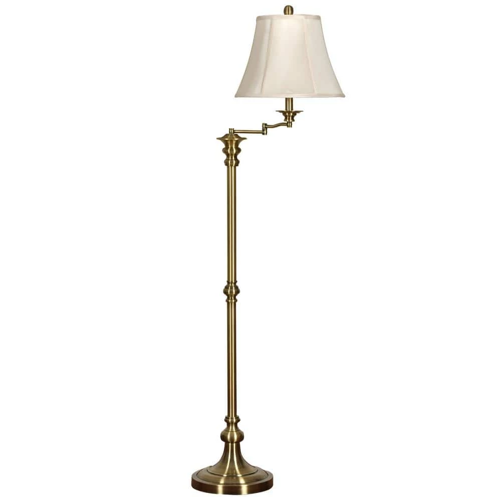 A classic look for the modern home, this adjustable single arm floor lamp is crafted with a swing arm in antique brass metal. It features a white softback fabric shade with a gentle outward taper designed to lend a uniqueness to its look. With its traditional profile and subtle design elements, it’s a must have sofa-side accent for the casual home.
