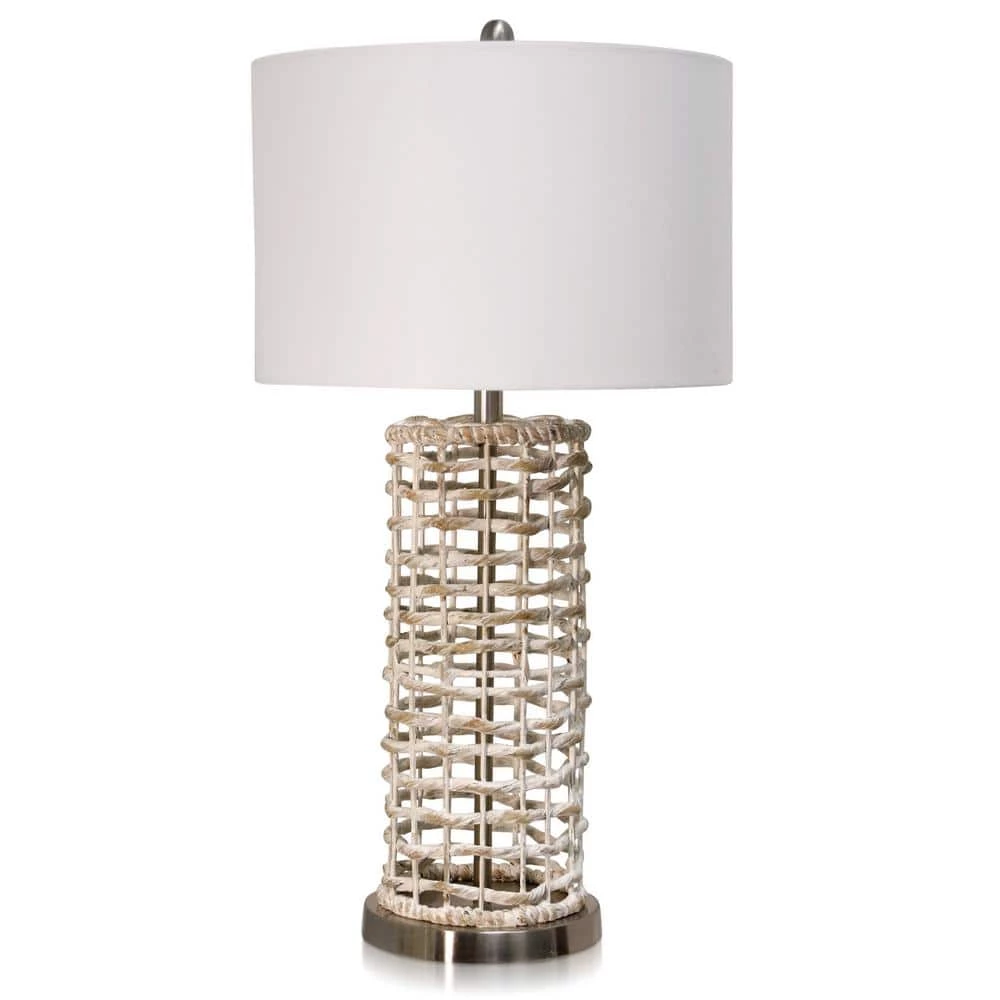 A standard form with unparalleled detailing, this table lamp offers a bold accent for an end table, mantle or buffet. The metal body features whitewashed hyacinth branches that create its cylindrical form, matched by the drum shape of the white linen shade. A chrome finish dusts the metal body and accenting finial, giving the extraordinary body a sleek shimmer.