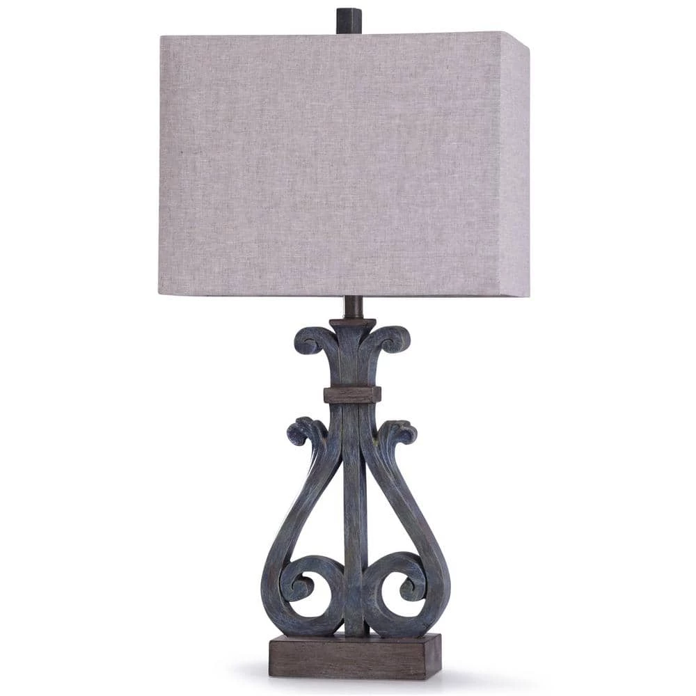 Intricate design gives this traditional style table lamp a powerful presence. The blue distressed twisted metal body features polyresin and silver hardware accents. An impressive oatmeal hardback shade forms a rectangular frame over the base, leaning into the piece’s rustic aesthetic. Traditional farmhouse style makes this an exceptional lamp for living rooms, foyers and dining rooms.