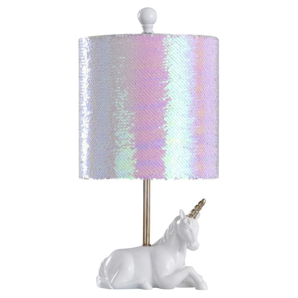 This Gloss White Unicorn Table Lamp by StyleCraft is a fanciful touch with iridescent touches in its shade that bring it to life. Ideal for both kids and adults alike, this lamp is made with a white resin base that is complemented gold tone horn and center rod touches with a linen shade. It’s a shimmering sequin touch for bedsides, play rooms, and more.