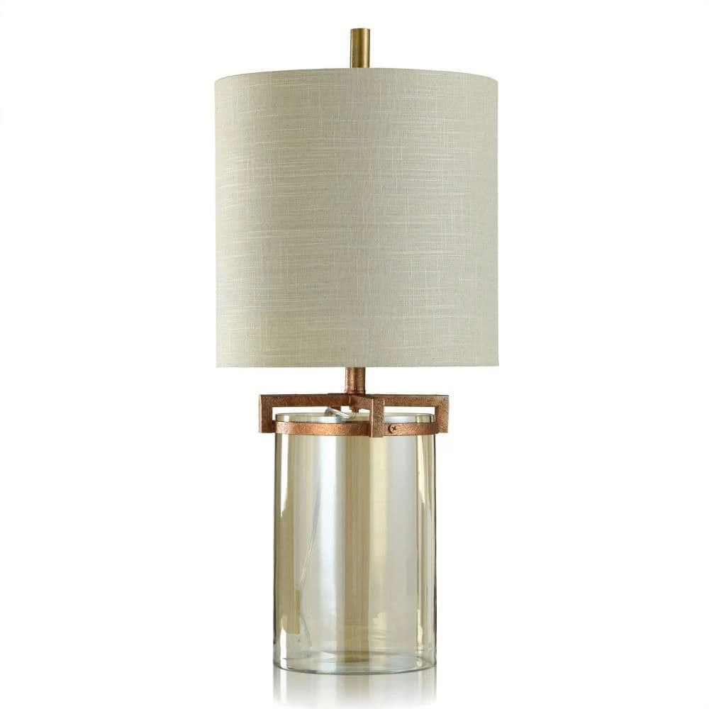 The StyleCraft Goldstone Glass And Steel Table Lamp exudes a vintage-inspired modern aesthetic. With a smoky cylindrical glass body, copper finished framework and a cream linen shade, this light is understated and cool. Brighten up the living room, bedroom, or hallway with this tasteful table lamp.