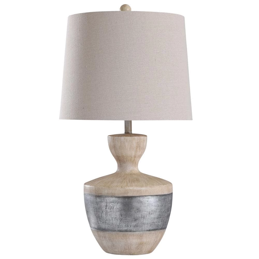 The Haverhill table lamp features a rounded polyresin body with a light wood-like finish. A thick silver band goes around the body to lend a visual contrast and a modern touch. It’s an excellent neutral choice for a nightstand or for extra lighting in the bedroom.