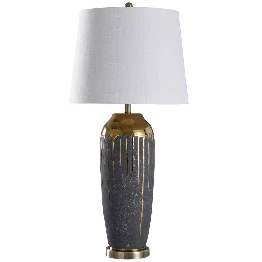 The Marloe Gold table lamp pairs a textured ceramic jar with a metallic gold accent drip to create a look that’s equally earthy and elegant. Capped with a clean white hardback fabric shade, this lamp is a touch of contemporary style that’s elegant and welcoming for any design tradition. It’s a wonderful addition to bedsides and living rooms, especially as a bold accent to muted earth tones.
