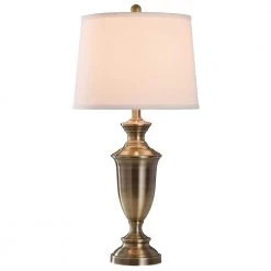 27 in. Distressed White Table Lamp with Textured Beige/Gray Hardback Fabric Shade by StyleCraft