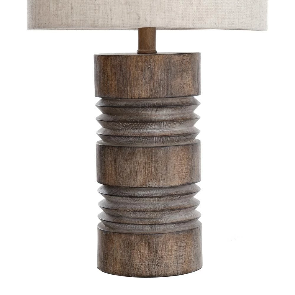 - Base of lamp is designed with a ribbed design into the poly resin with a wood-like finish appearance